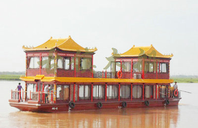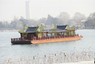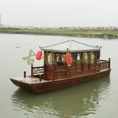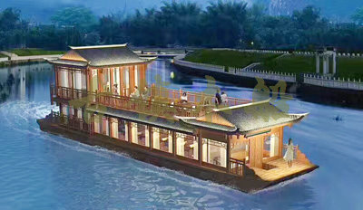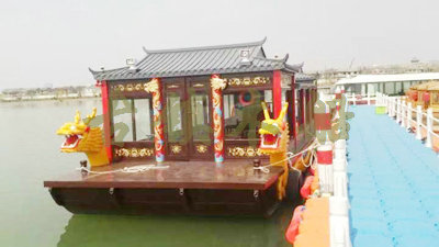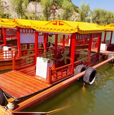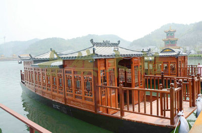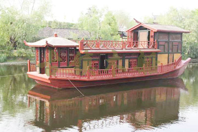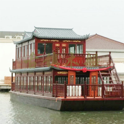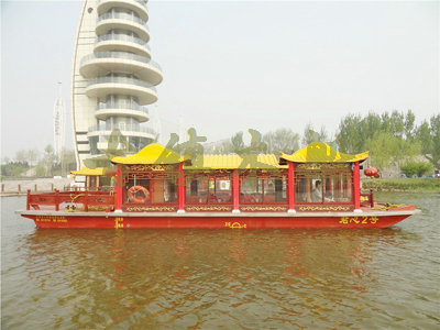 畫舫船就是裝飾古典華麗的游船,是"中國風"的仿古游船,結合古典園林建筑,體現(xiàn)了中華文明的古典藝術.畫舫船豪華而又古典,船上的建筑按照中國古代建筑里的亭臺樓閣,建筑工藝之復雜,要求之嚴格,仿古畫舫游船的特點飛檐翹角、玲瓏精致的四角亭子逐漸成形,赫然立于船頭,美人靠、盤龍柱子、彩畫……龍柱上的浮雕盤龍和祥云一層扣著一層,層層錯落有致,雕刻精細到盤龍身上的每一個鱗片都細細可數(shù),古代皇家標志性元素,在畫舫船上體現(xiàn)的淋漓盡致。除了雕刻、花窗,整條船還有一個看點,那就是弧線優(yōu)美、高高翹起的船尾。游船并不大,長約10米、寬3米,但是整體看起來堪稱一件藝術品。船尾的雕花欄桿與船艙、船頭的雕刻遙相呼應,船身四周貼著浮雕祥云,給整條船增添了富貴、華麗的氣質。